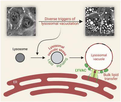 This study uncovers LYVAC (lysosomal vacuolator), a lipid transfer protein at the ER–lysosome interface, as a key driver of lysosomal vacuolation under stress. LYVAC-mediated directional lipid transfer to stressed lysosomes enables rapid membrane expansion and lysosomal vacuolation. This is a general cellular response to diverse medical conditions with broad implications in health and disease.